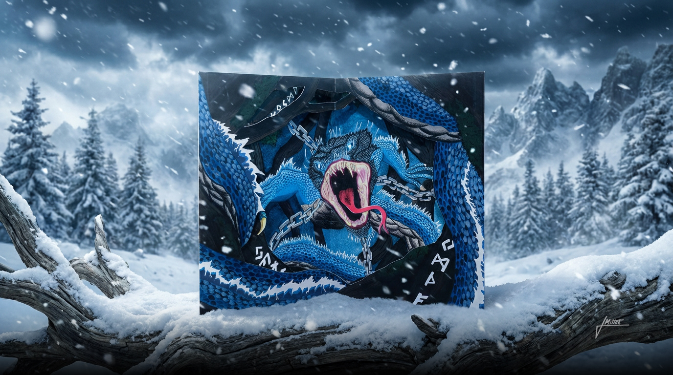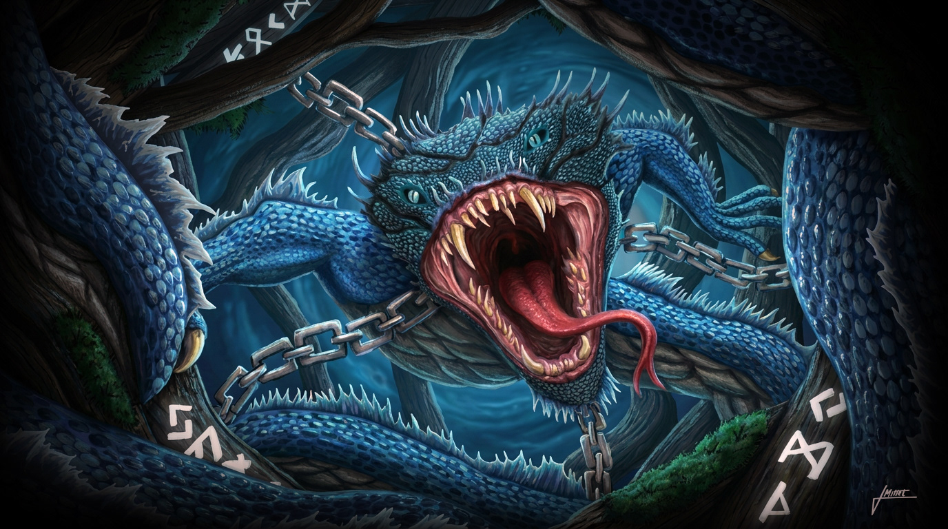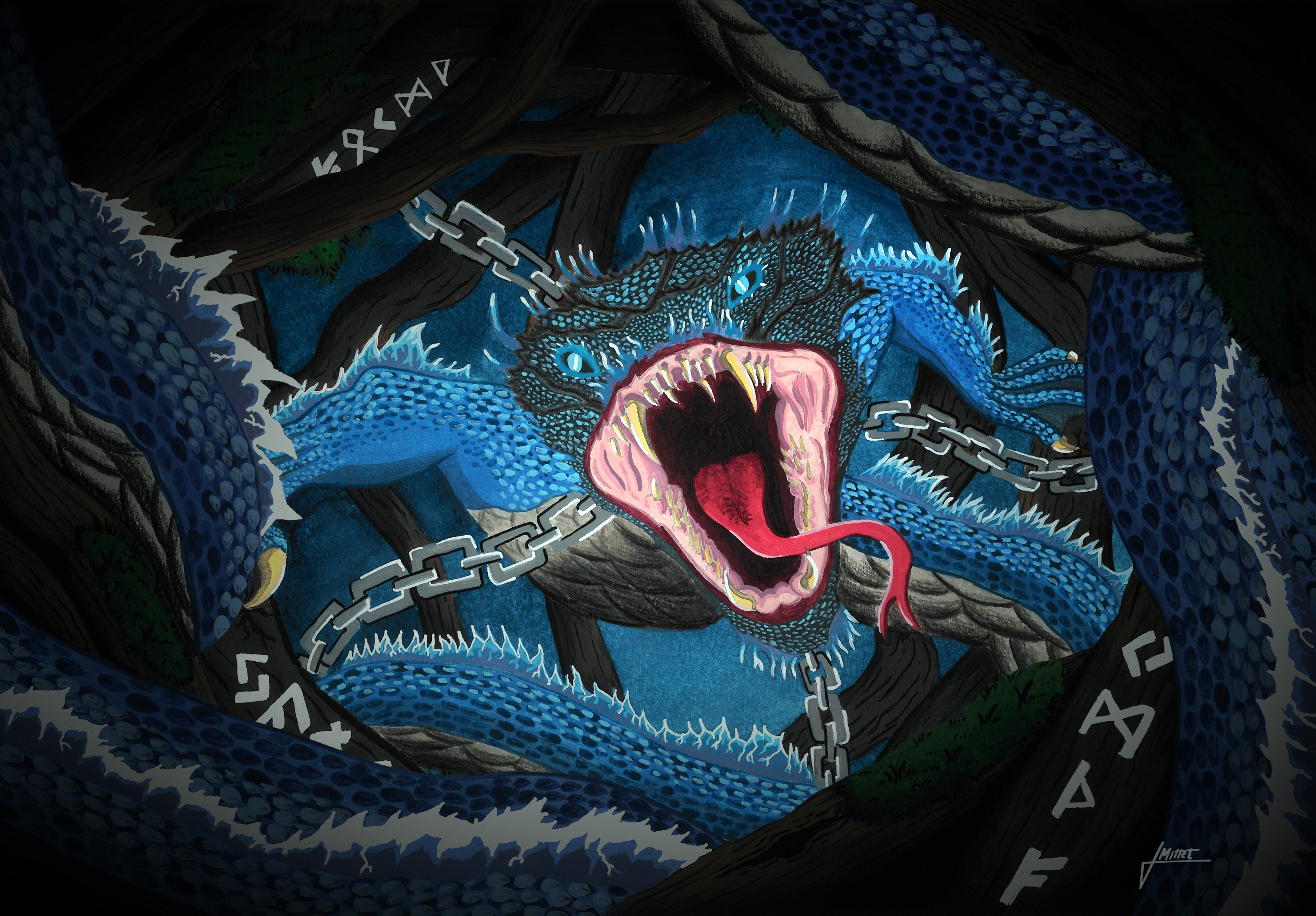 Sa présence souligne la dualité inhérente à la mythologie nordique, symbolisant la lutte éternelle entre l’ordre et le chaos, la vie et la mort.