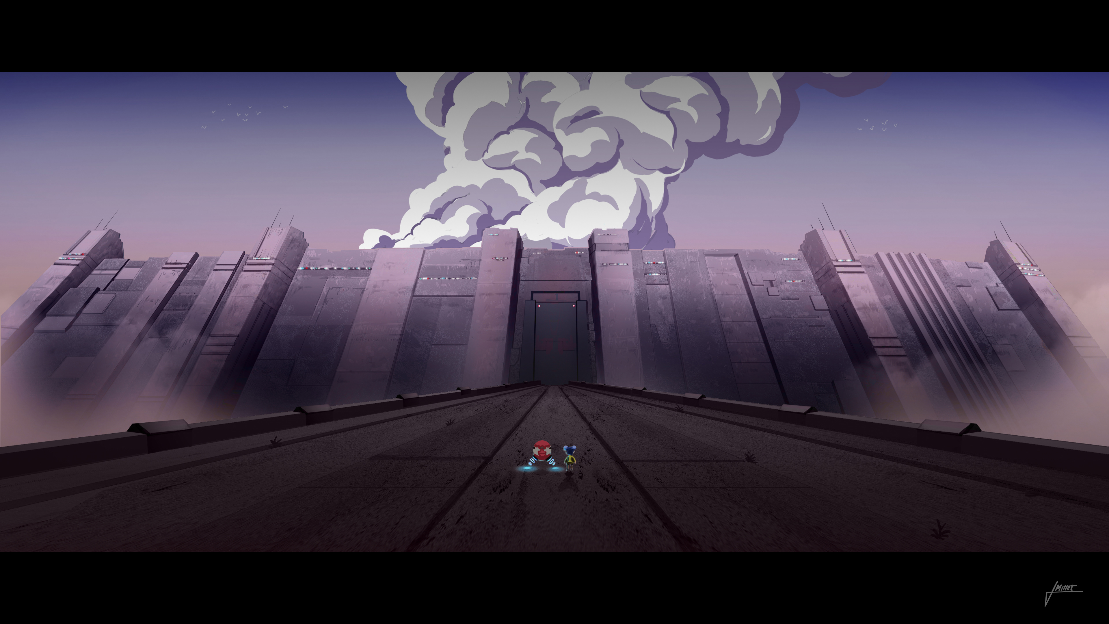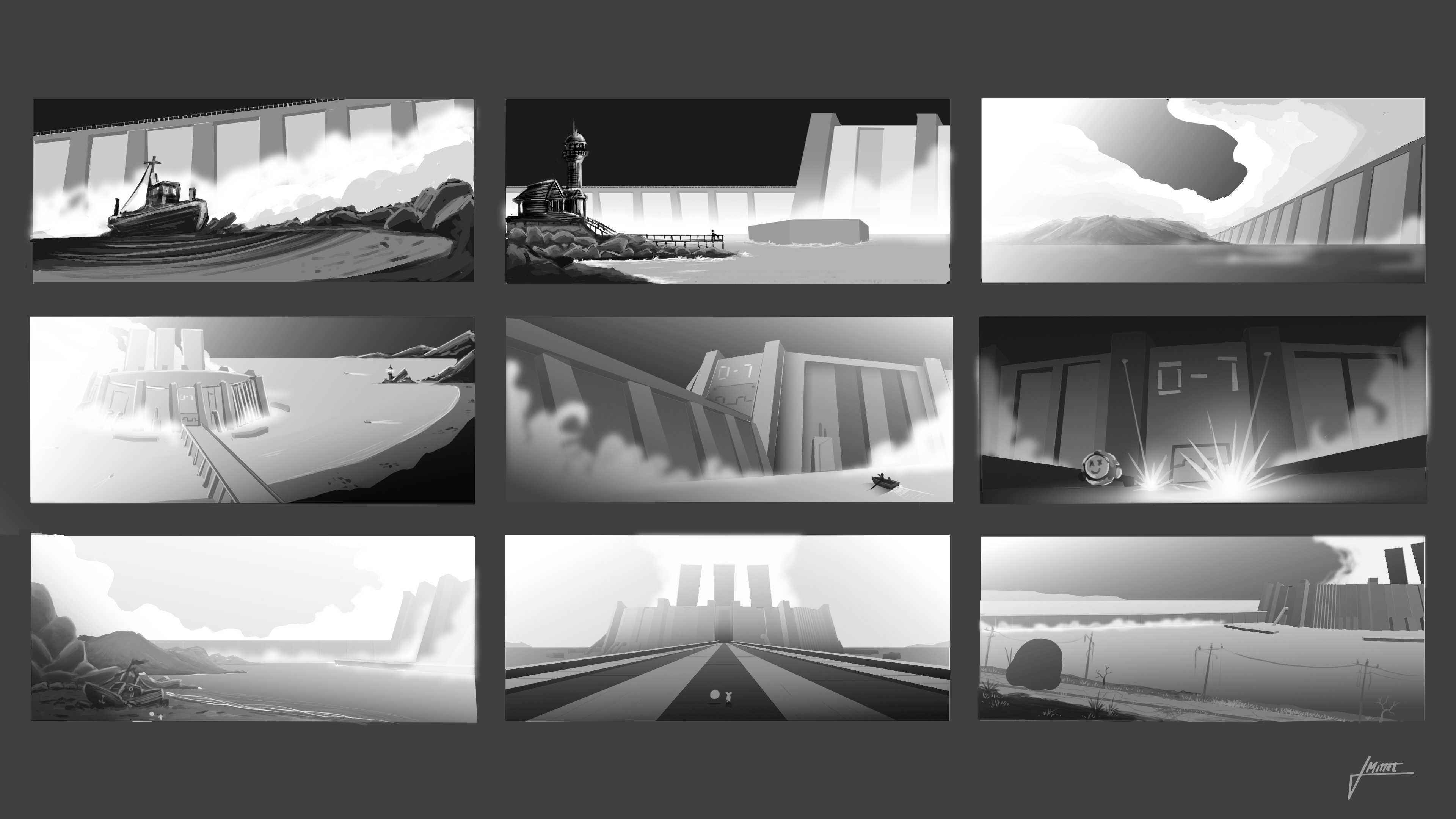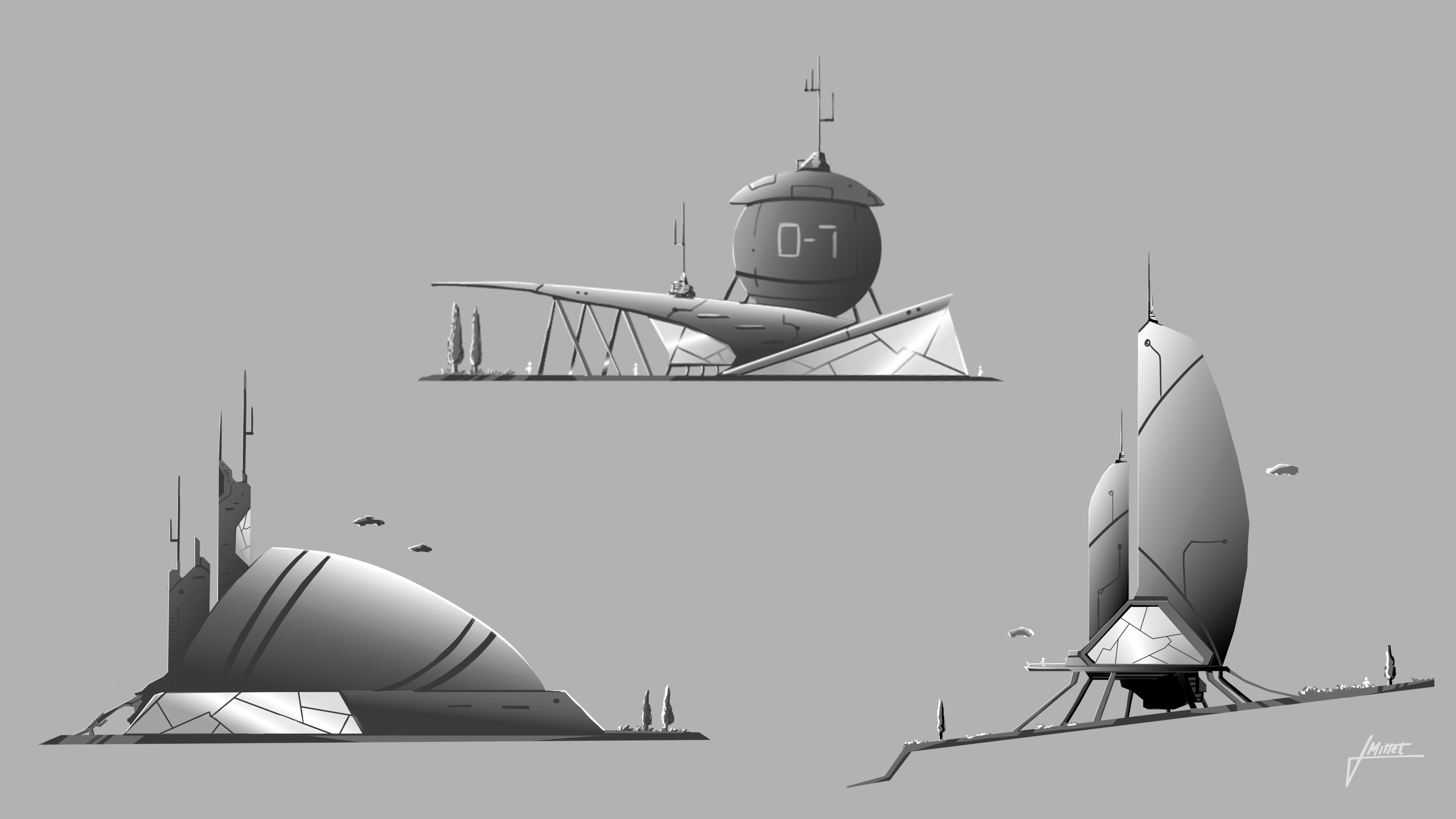 Planches de propositions de design des bâtiments présents dans la cité, planche de recherches sur le fonctionnement énergétique de la cité et recherches de cadrage pour le key art.