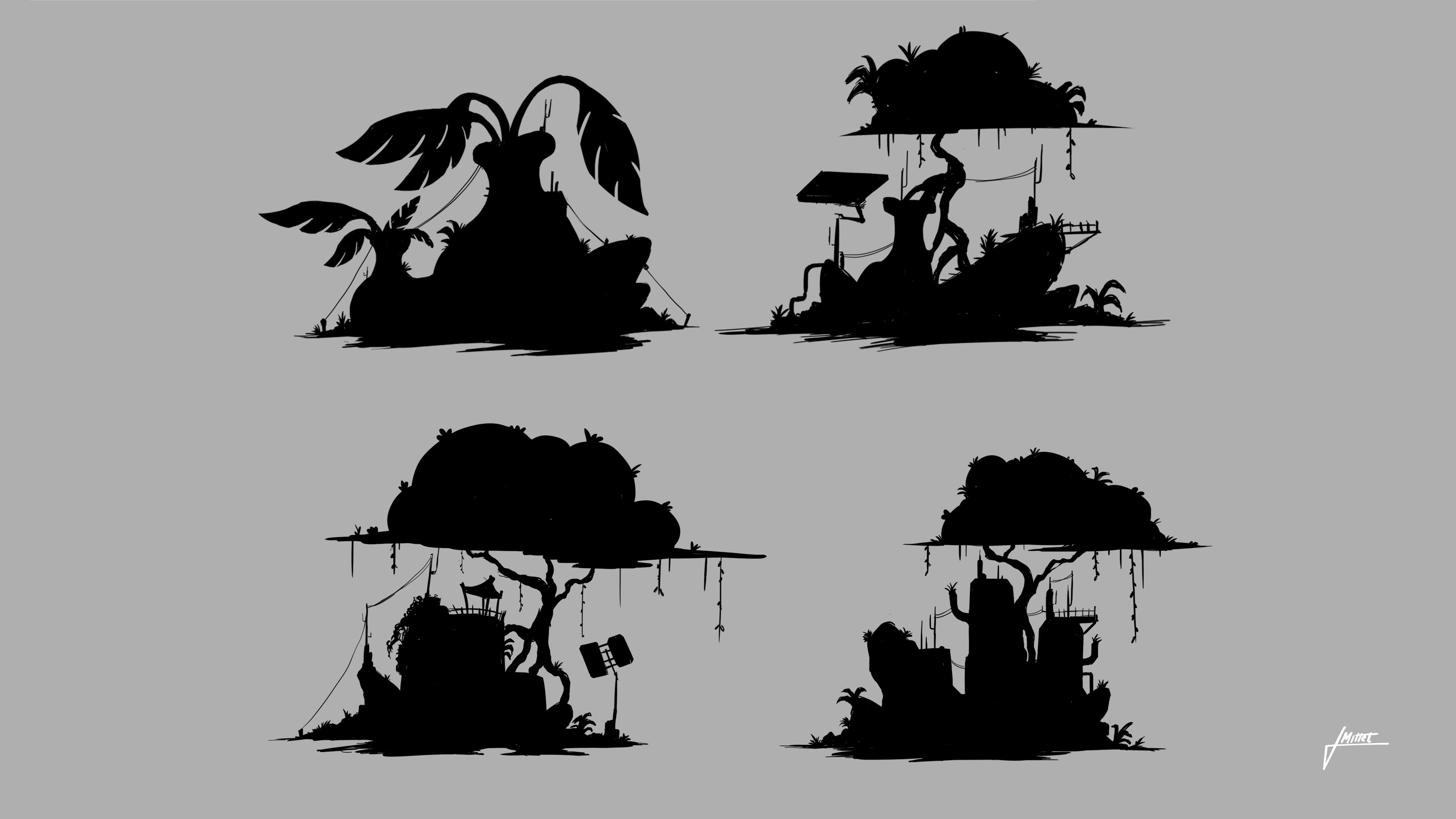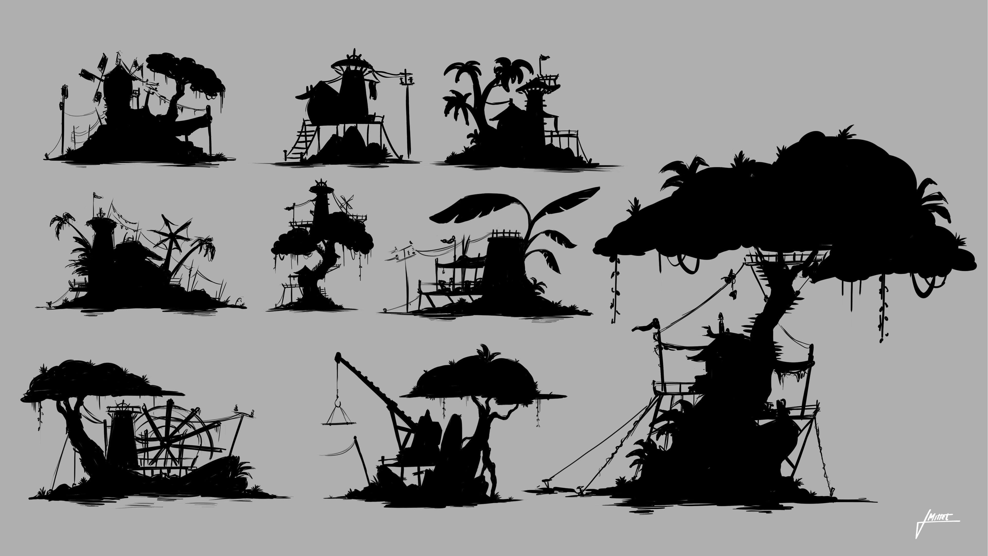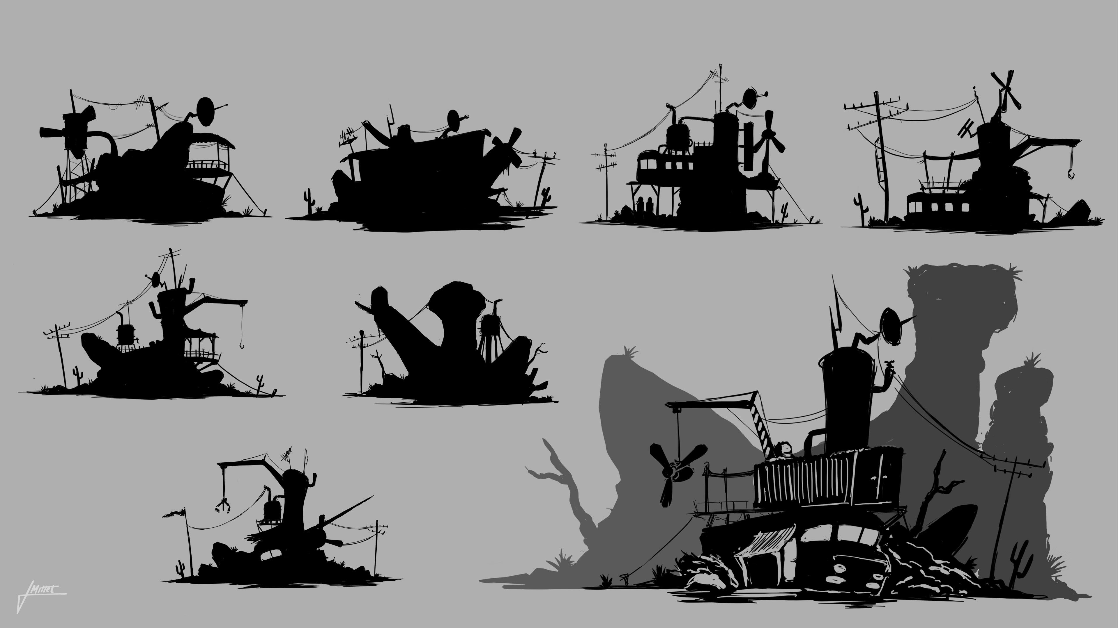 Planche de recherches sur des silhouettes de maison dans une décharge et une forêt.
