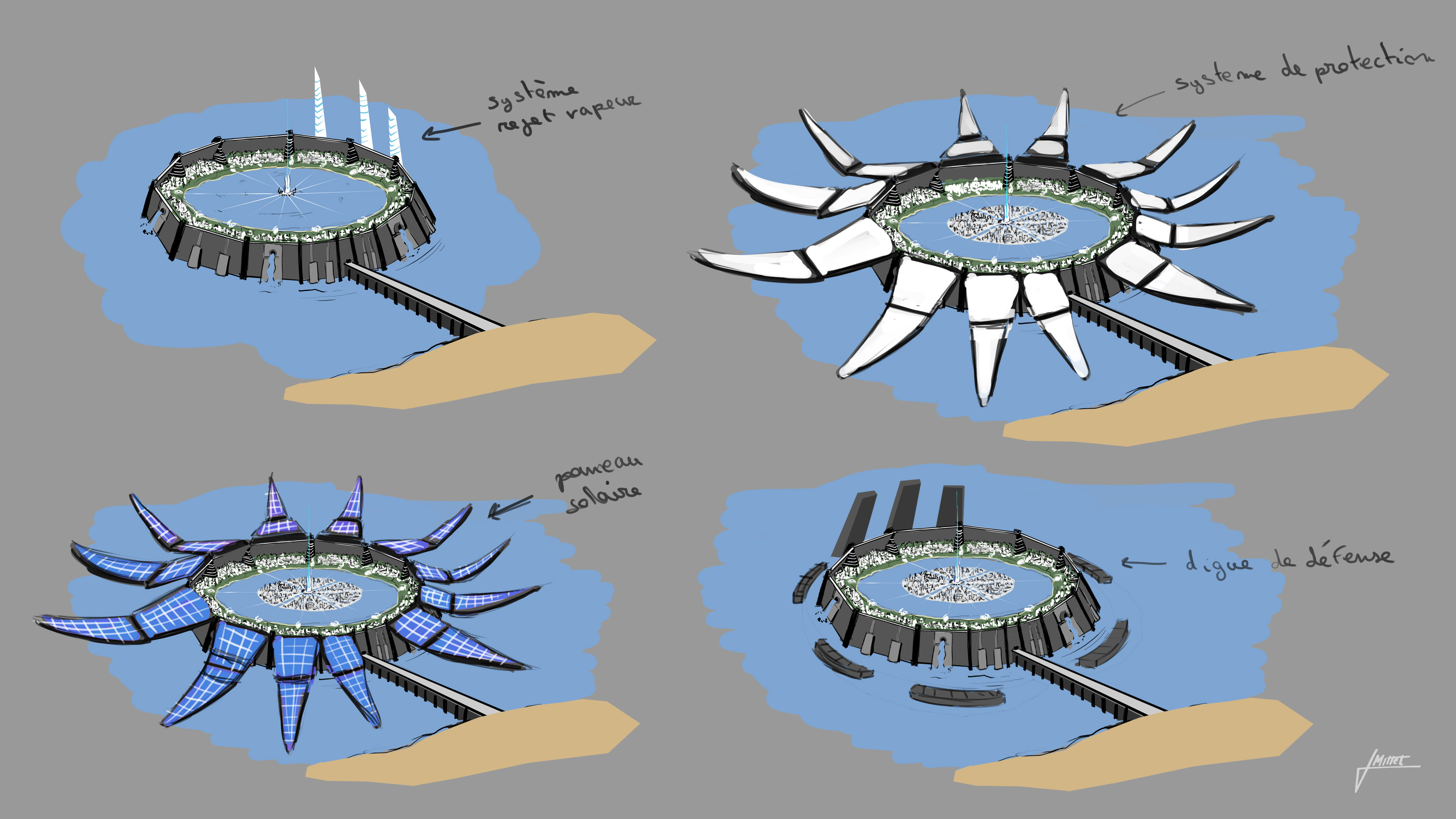 Proposition de design : Proposer plusieurs concepts de design pour la cité futuriste, en tenant compte des directives artistiques de mon maître de stage.