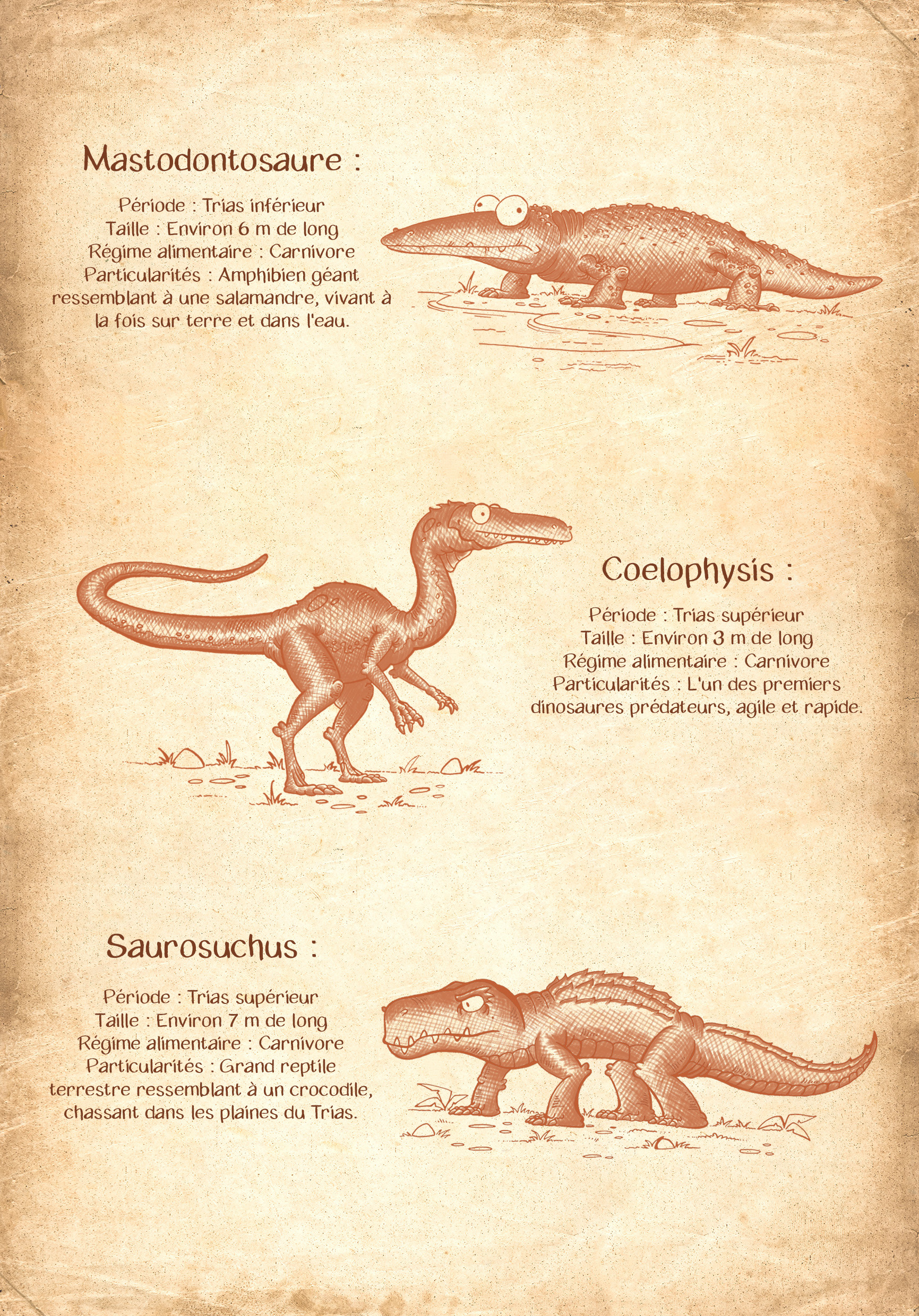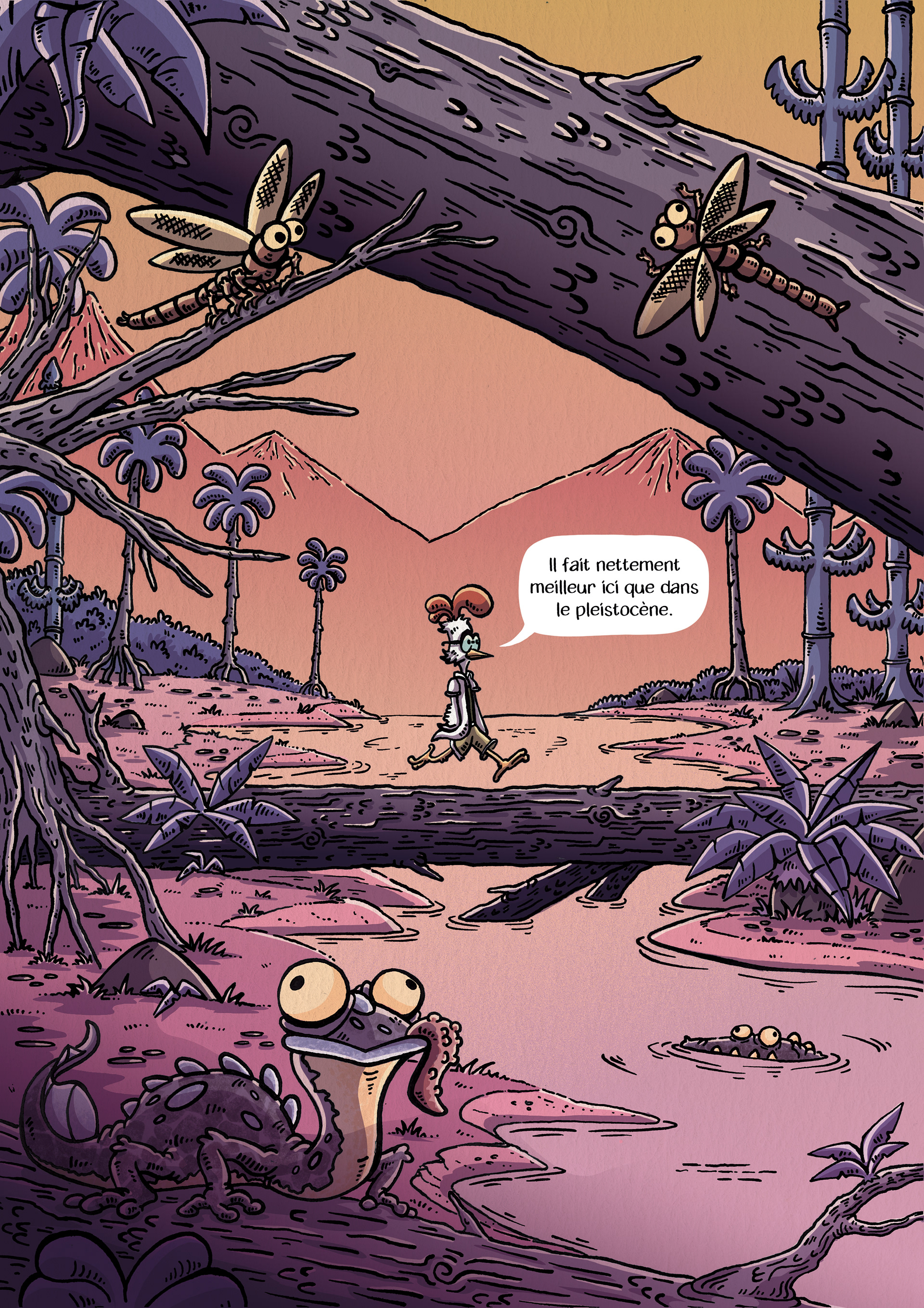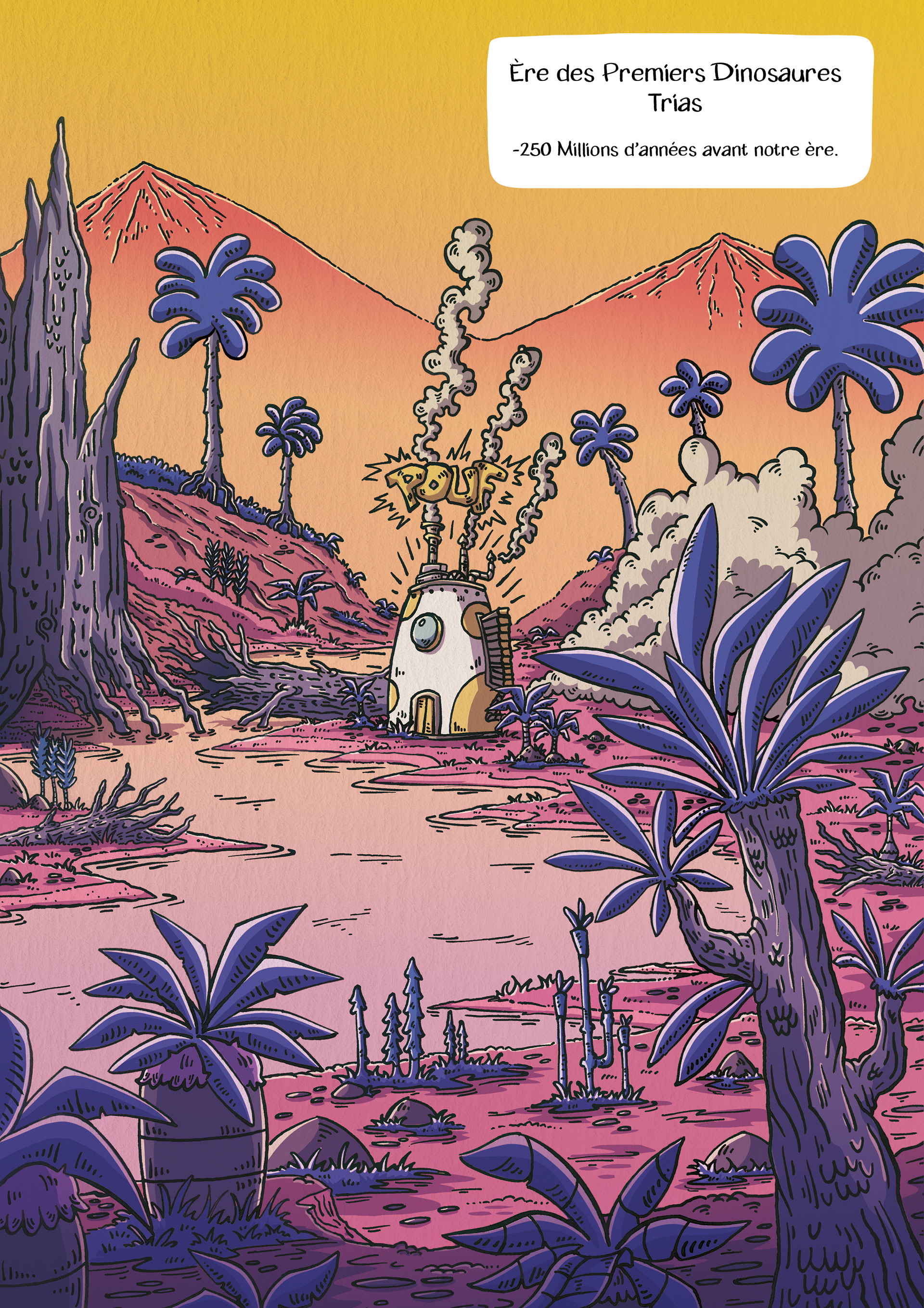Entre les plaines du Pléistocène, les premiers pas des dinosaures du Trias jusqu’au Crétacé, Clovis devra faire preuve de malice, de courage… et d’un humour à toute épreuve pour survivre et mener à bien sa quête.
